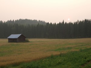 minulle hyvin rakas maisema, kypsyvä viljapelto, metsän takana metsä, iltapilven hento punerrus kaiken yllä. viljankorjuun ja syyskyntöjen jälkeen maisema tummuu, kunnes lumen valo sen taas avartaa. täällä ei surra eikä huokailla maailman sotia ja kriisejä. en kanna minäkään huolta tulevista päivistä. luotan, että kyntö, kylvö, kasvu ja korjuu jatkuu – elämän ehjä peruskuvio.