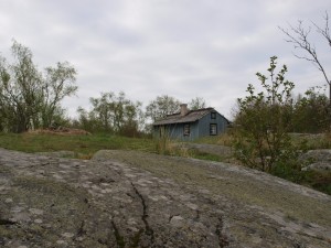 Jo lähtösatamaan tullessa tajusin, että kertakäyttösadetakkikin on parempi kuin ei mitään. Siis kurvasimme kaupan kautta. Tottuneilla saarenkävijöillä oli tietysti oikeat sadepuvut. Sateenvarjo olisi ollut naurettava kapistus tällä matkalla eikä sitä kellään ollutkaan. Pisaraista merituulta ja pärskeitä halkoen kiisi taksivene perille tunnin matkan päähän Korppoon Galtbyn venesatamasta Kihdin selällä sijaitsevaan Jungfrukäriin. Kohta perillä kävi selväksi, että tämä on survival-reissu minun mittakaavassani. Eikä kaduttanut yhtään.