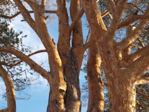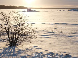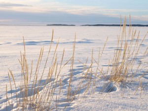 Otan silmiini sinisiä varjoja, kaislojen himmeää okrakultaa, lumen laikuttamien luotojen jyhkeät hahmot. Kuuntelen ryhmyoksaiset männyt, juurineen tiukasti kamaraan pureutuneet, latvuksissaan tuulen hilpeä vihellys. Kosken kaarnan punertavaa silkkiä, poskellekin pehmeää. Tuuli tempaa arkiset ajatukset, tunnot kaiken turhuudesta. Kireys katoaa, on tilaa hengittää syvään, syvään.