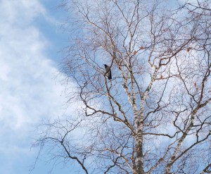 Palailen verkalleen aukean halki kulkevaa tietä. Pellolla on kaksi punaista koppia, joiden tarkoitusta voi miettiä. On hiljaista. Hanki heijastelee aurinkotimantteja. Luulen olevani ainut olento maisemassa, kunnes äkkiä koivusta yläpuoleltani kuuluu toteava: krraak. Mitä ikinä varis tarkoittikaan, otan sen tervehdyksenä ja vastaan ääneen: heipähei sullekin.