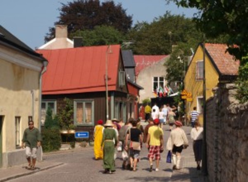 Toisen Gotlannin päivän olemme jättäneet Visbyssä kuljeskelulle. Aamupäivällä pakkaamme tavarat autoon, jätämme sen keskustaan parkkiin ja pujahdamme portista muurien sisälle. Jo lähtösatamassa jaetusta matkailulehdestä on käynyt ilmi, että meneillään on Keskiaikafestivaali, Medeltidsveckan. Kaikkialla vanhan kaupungin muurien sisällä vaeltelee tyyliä mukaileviin asuihin pukeutunutta väkeä, monilla mukanaan sen aikaisia työvälineitä tai kaupusteltavaa tavaraa.