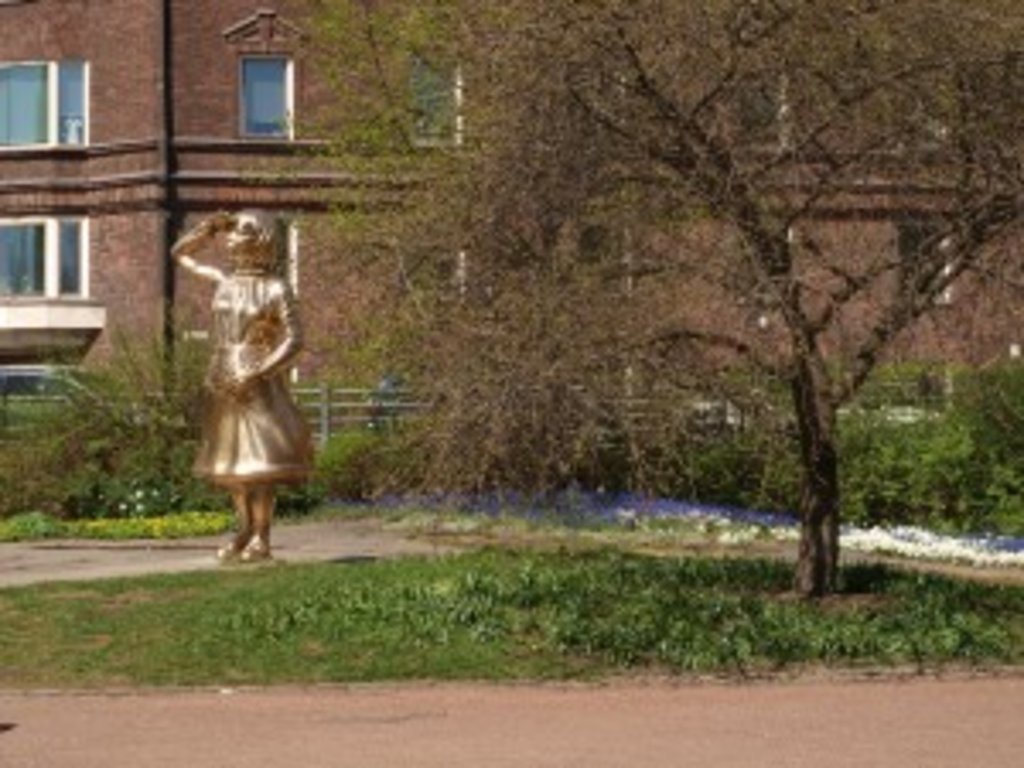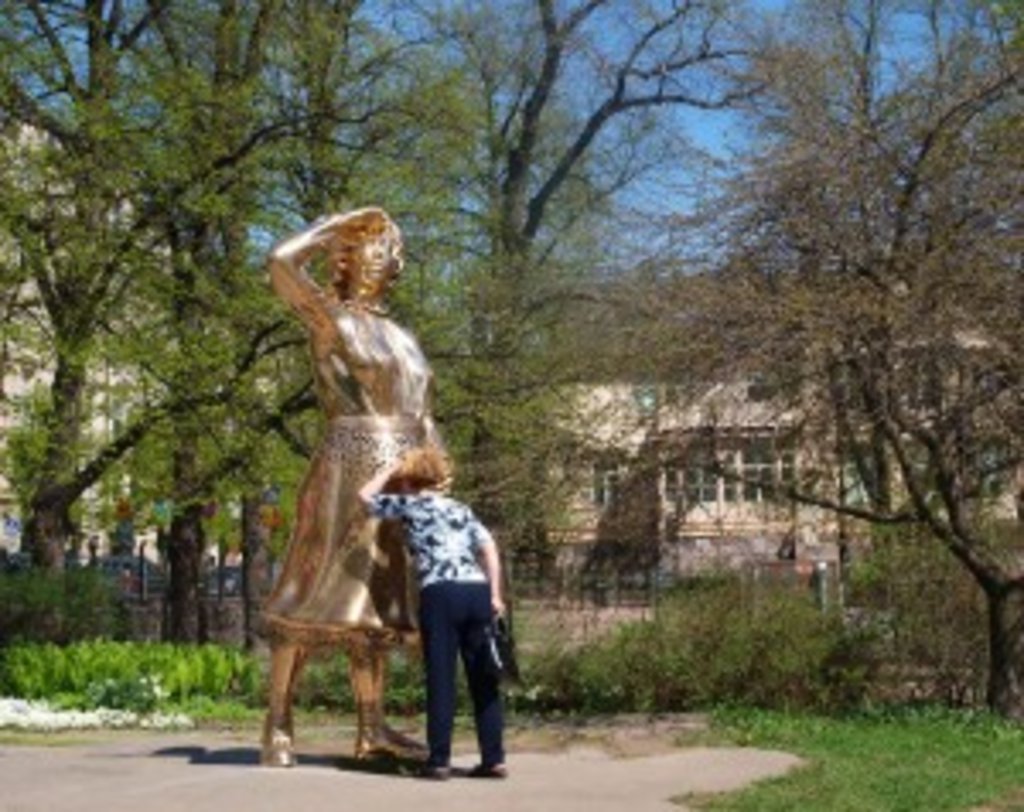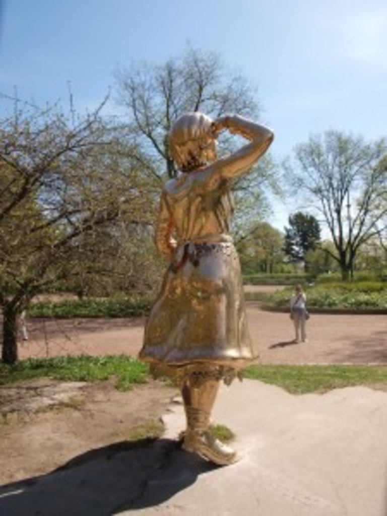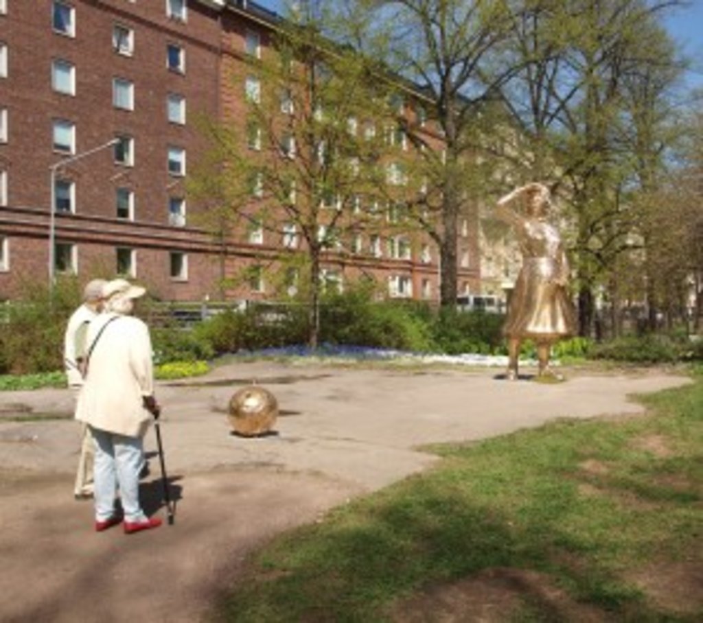Viime viikolla kävimme Leidiporukalla tsekkaamassa uutuuttaan kimaltelevan Pekka Jylhän muovaaman veistoksen Kaivopuistossa. Ihmettelijöitä oli muitakin, tässä muutama neljänteen ikäänsä ehtinyt. Leidi T. halusi peräti nähdä mitä veistoksen valoa hohtavan vatsakummun sisuksissa on. Odottava äiti on yli kolme metriä korkea, painaa 800 kiloa, seisoo jalat tukevasti peruskalliolla ja tähyilee merelle. Patsaan seuraksi kuuluu reippaankokoinen ’rantapallo’ vähän sivummalla.