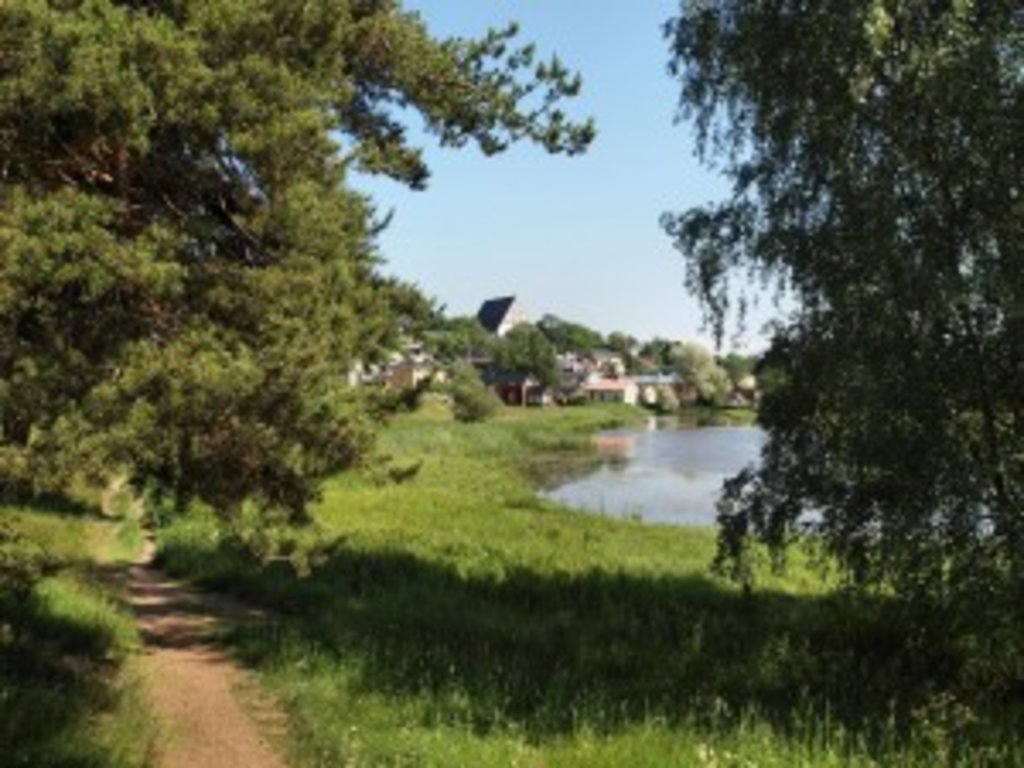 Porvoo, kaupunki joen tuntumassa. Kesä, romanttisia pihoja ja kujia, kaikki niin ihmisen kokoista, rauhallista. Kirkonmäellä hääpareja, Linnamäellä uljaita puita, varjojen leikkiä. Jokipuistossa lasten iloa ja nuoruutta aurinkonurmella. Hyvää ruokaa, muutama soma putiikki auki.